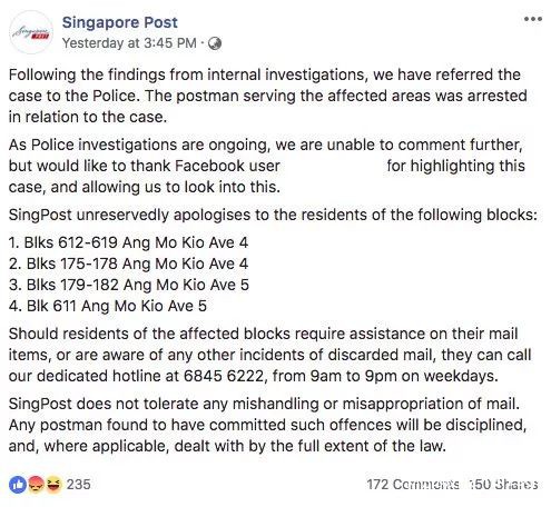 在昨天下午3點多,Singpost再次發文:涉及此事的郵遞員現在已經被警方逮捕,事件也已經移交警方,SingPost不方便進一步置評。