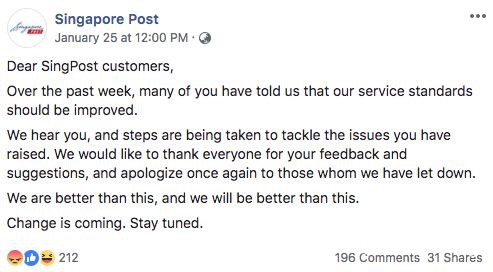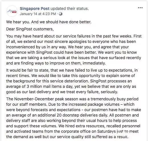感覺2019開年以來,SingPost一直就在道歉。首先是1月14日發出長文,對大量用戶的投訴表示道歉,解釋了年末高峰期信件量超高的情況,並表示會做出更好的改變。