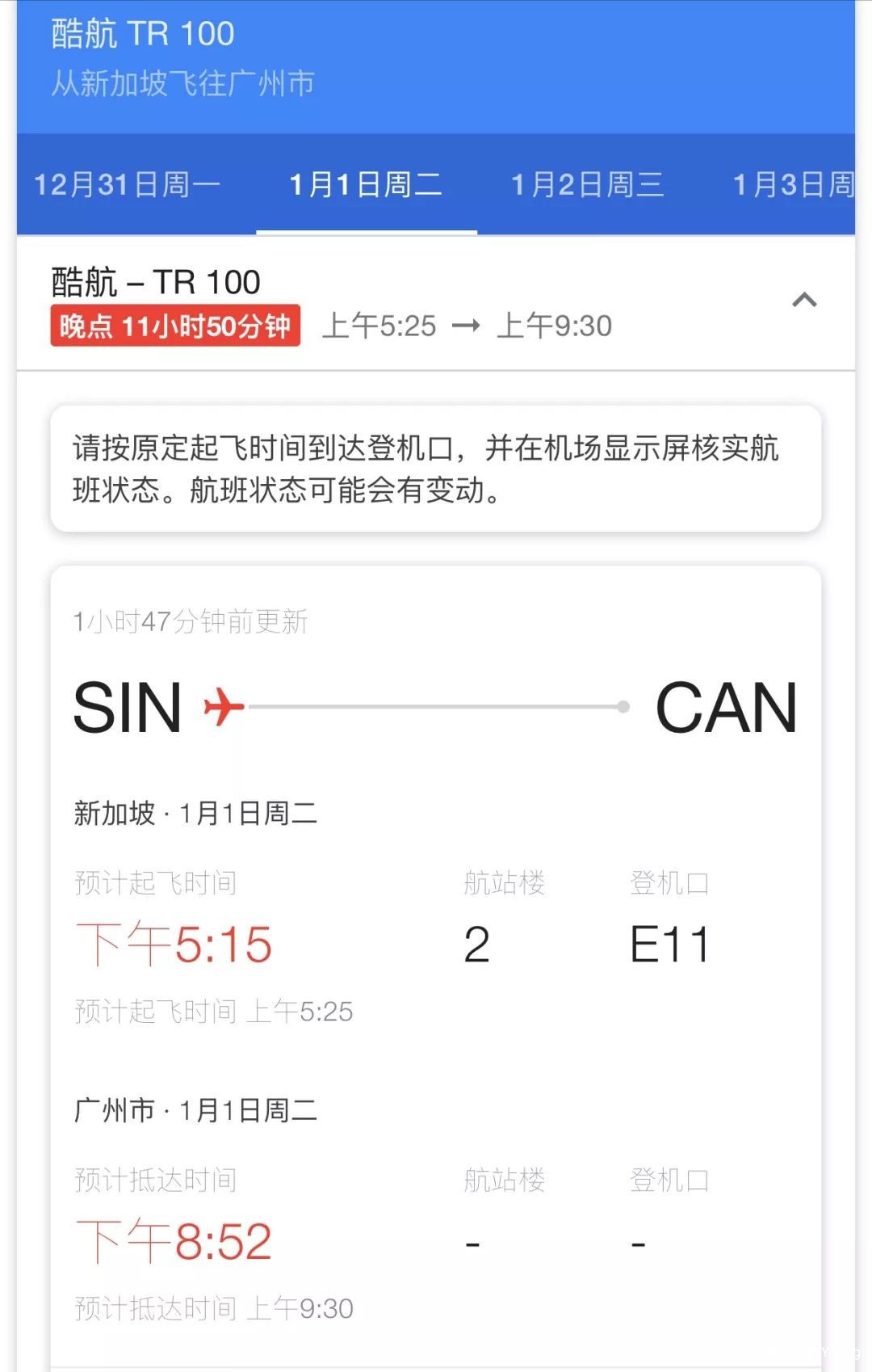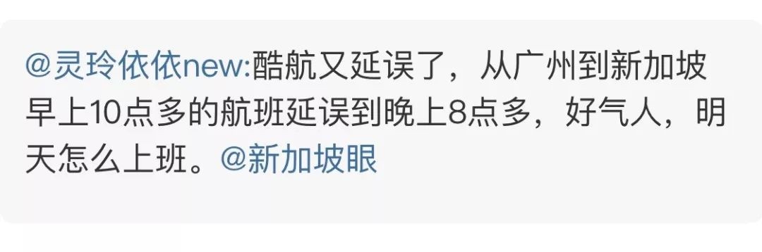 酷航又大延誤,大批乘客被困新加坡和廣州機場跨年 2021 年 3 月 10 日 国医精诚 新年的第一天,酷航又傳來延誤的消息,截止目前,已延誤12小時了! 此次受影響的是廣州飛新加坡的TR101航班。 TR101的前序航班從新加坡飛往廣州的TR100,顯示晚點11小時50分鍾。 有的被活生生拒絕在回新加坡路上,擔心明天無法上班。 網友表示,已經通報延誤三次了! 感覺對酷航越來越沒信心了…… 相關文章:江西黑貓炭黑股份有限公司 關于聘任高級管理人員及其他相關人員的公告搞什麽飛機?!亞洲最准點的樟宜機場被誰拖了後腿截止目前,愛奇藝全線崩潰!美國檢出率高達10%,疫情觸達爆發臨界點,該我們出手幫忙了嗎?從0到363億美元,“亞洲生物之城”新加坡的進階之路酷航又增一條中新航線,南航這個航班已被連續停飛兩次 財經
