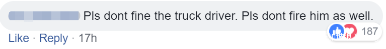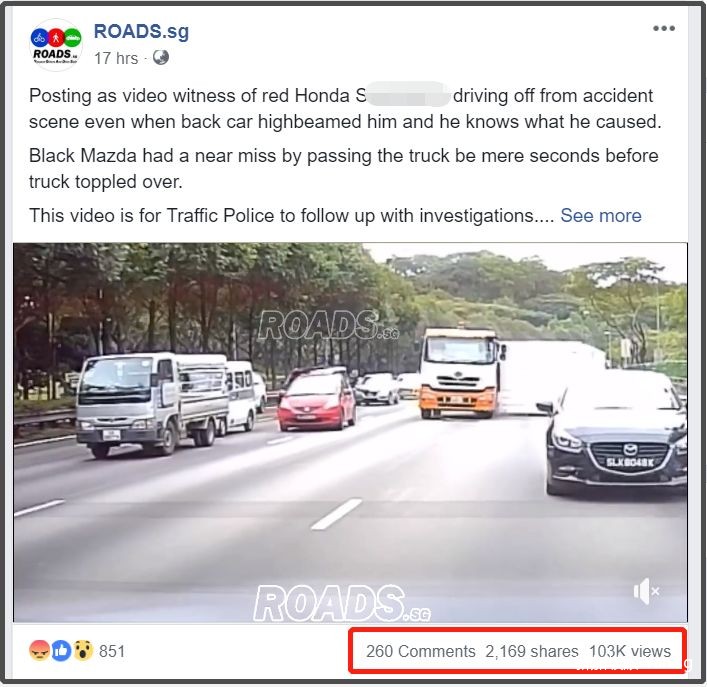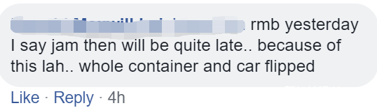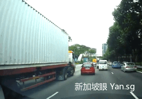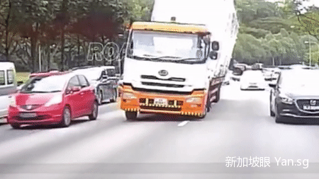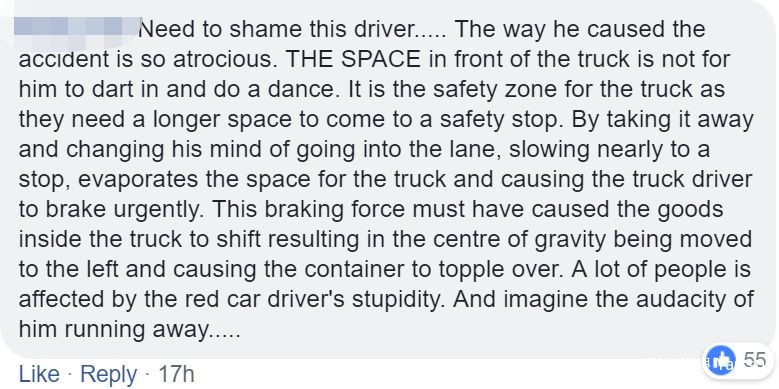 (這個(紅色轎車)司機簡直差透了。卡車前面的空間不是讓他超車的,那是卡車的安全區域,因爲卡車需要更長的時間安全地停下來。紅色轎車任意換車道,讓卡車根本沒空間減速,只能緊急刹車。刹車的沖擊力導致卡車內的貨物移動,讓車的重心偏左,導致容器翻倒。很多人都因爲紅色轎車司機的愚蠢而受影響。沒想到他居然還有膽逃跑…..)