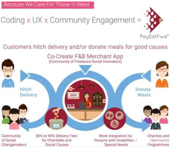 這個app的目的是爲了PayEatFwd Movement——用一句話說,就是當你需要食品外賣的時候,你可以讓附近500米之內的人(比如說殘疾人士)幫你帶外賣,你付的外賣費的一大部分就可以作爲他們的工資。這種情況叫做Hitch Delivery