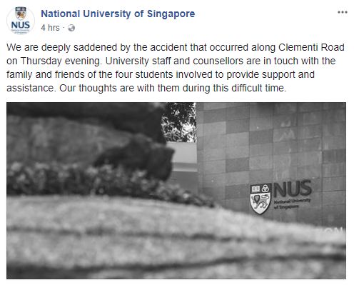 當天坐在德士中的4人均是新加坡國立大學的學生,今早國大發貼文,對發生的事故深表難過,學校的職員和輔導員會爲這四名學生的家人和朋友提供援助,陪伴他們走過這段艱難的日子。
