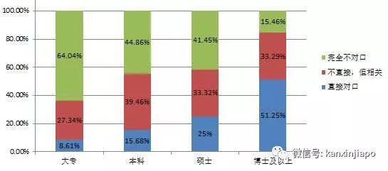 不過,56.7%的應屆生表示就業崗位與所學專業完全不對口,只有1/4的應屆生就業崗位與所學專業直接對口,其他應屆生表示就業崗位與所學專業相關。
