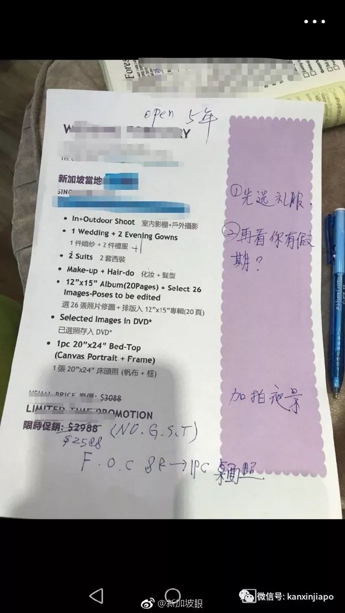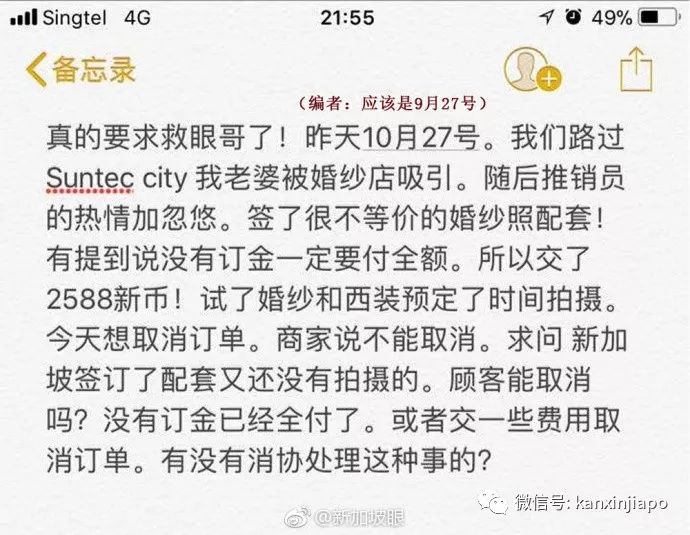 默認標題_自定義px_2021-02-23-0.png編者按之前接到網友求助,“與婚紗店簽好拍攝訂單,又沒拍攝,顧客能取消嗎?”現在求助者說事情已解決。不過在這過程中,包括與消協、商家人溝通中,有給予網友借鑒的地方。新加坡眼也征得當事人同意,發出來給大家提個醒。拍婚紗照時,三思而後定。