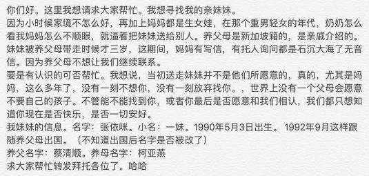 網友說“我知道的信息就只有這些。如果找到了,他們願意相認,可以發電郵[email protected]或者[email protected]給我,我們隨時歡迎他們回家。如果他們不願意,這件事就此打住,我會告訴家人們找不到了。