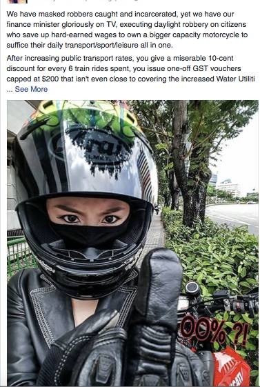 擁有兩輛Ducati摩托的她,還在網絡上直抒胸臆表達不滿,痛批預算案是赤裸裸的搶劫,引來不少騎士表示贊同。