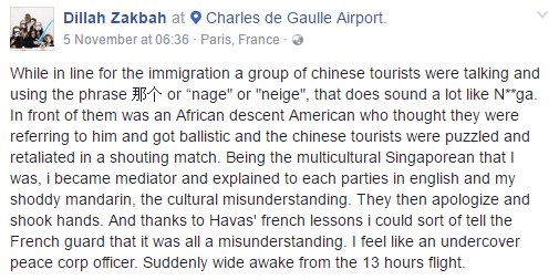 31歲的馬來族新加坡女子迪拉前幾天在Facebook發文,說自己在法國戴高樂機場平定了一場“中美紛爭”。簡單說就是:中國人和美國人吵架,新加坡人勸架。