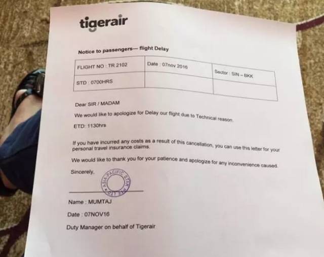 虎航TR2102從新加坡樟宜機場飛往泰國曼谷的航班,原定早上7點起飛。