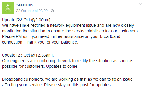 ▲關于上周六斷網的聲明,StarHub表示網絡在搶修ing…