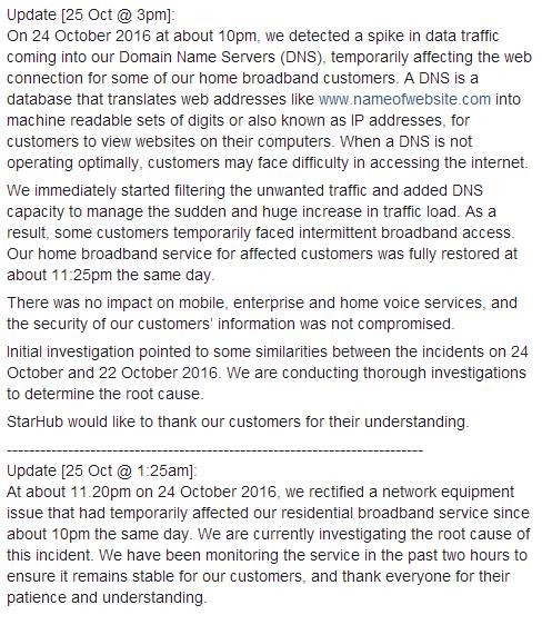 ▲StarHub發布關于本周一的斷網聲明