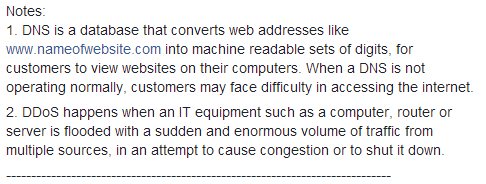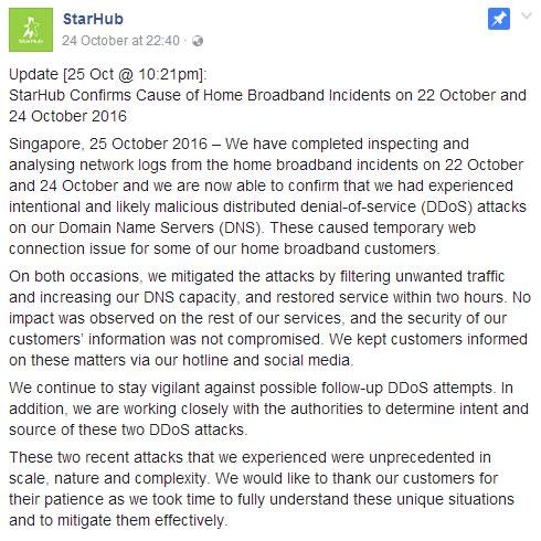 最後終于證實,竟然是因爲黑客襲擊!這些故障都是惡意的“分散式阻斷服務”攻擊而造成的。不過大家先別驚慌,StarHub表示顧客的資料沒有外泄。