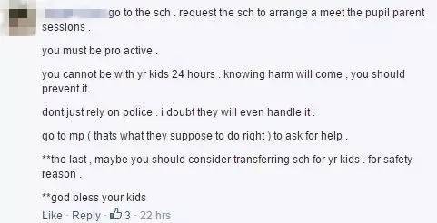 “去學校,要求學校安排一個家長會面。你必須要很主動,你不可能24小時跟孩子在一起。知道有傷害要發生,就應該去避免它。不要只是依賴于警察,我都懷疑他們是否會處理這件事。最後,從安全角度考慮,你也許應該幫你的孩子們轉學了。希望孩子們一切都好。”