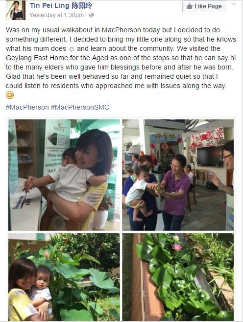 新加坡女議員陳佩玲,這個去年挺著大肚子參加大選的“美少女議員”,昨天下午在面簿上發了幾張她當天上午進行社區工作時,走訪居民和探望老人之家的照片。居然是抱著孩子去的。