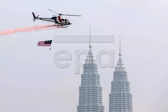 拉著國旗在吉隆坡標志建築雙子塔前飛一圈。