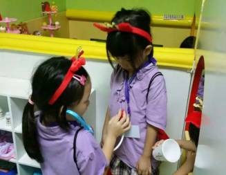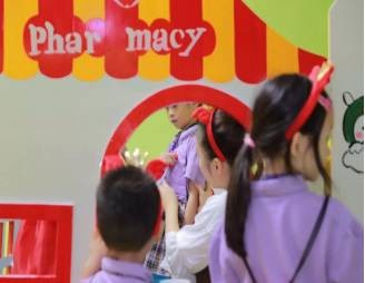他們在一個一百多平方米的大課室裏搭建了一個小人國,裏面有各種迷你版的小超市,圖書館,餐館,診所還有森林。。。員工都是專業的表演院校畢業的老師。