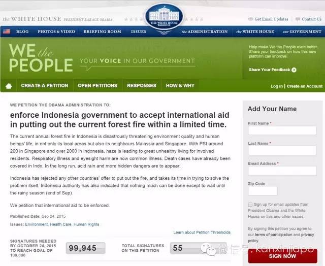 網友 @Joy_Wong_sg 寫了個請求白宮整頓印尼火災的請願書。大家如果閑著無聊可以看一下簽一下。如果有十萬人簽名,白宮就會做出回應!