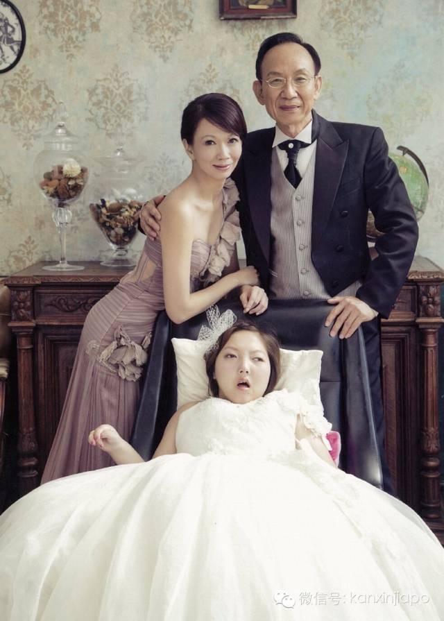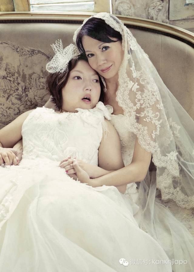 (新加坡眼按:帶著天生重度殘障的女兒,哪怕孩子的親生父親都選擇離開,這位堅強的母親一直不離不棄。從精神上、經濟上、心理上獨立支撐生活。在女兒17歲的那年,慈母再遇良人。也許女兒一輩子沒有機會出嫁,母親決定在自己的婚禮上,讓女兒也穿上一襲婚紗。在纖弱的身體下堅強樂觀的靈魂是讓人感動而且值得祝福的。)