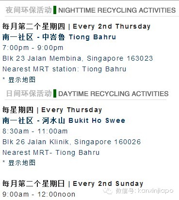 【全國再循環計劃】國家環境局自2001年起,爲每一個住宅區提供環保垃圾箱,或是某些地區的每戶政府組屋門前留下環保袋,每2個星期上門收集。電話:1800-225-5632