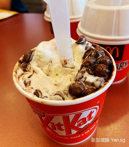 說實話,這個Kit Kat麥旋風吃起來沒什麽特別之處,感覺就是普通巧克力聖代加上一些Kit Kat的巧克力豆,有點甜,感覺還是原來的奧利奧麥旋風更好吃一點~