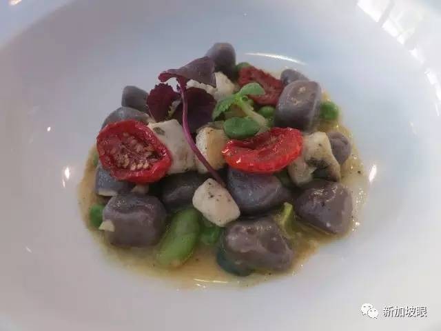 春季面食是紫番薯丸子(Gnocchetti di Patate Violette),番薯的紫色是來自土壤的天然顔色,軟Q彈牙,配料還有海鲈魚、蠶豆,鮮美清淡,小青豆的點綴帶出春天的感覺。