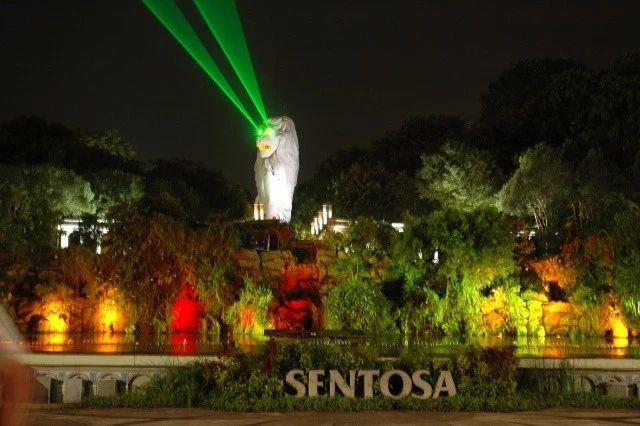 到了夜晚,這個魚尾獅眼裏泛著光,冒著殺氣,仿佛保護神一樣捍衛著聖淘沙的土地。