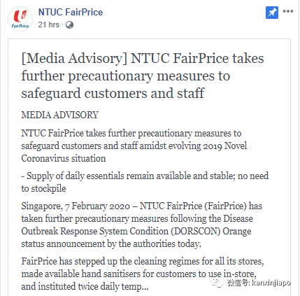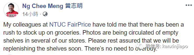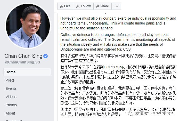 以下是部長講話原文:“有許多超市出現人群掃購食品和家居日常用品的現象。社交網站也流傳著超市貨架空蕩蕩的照片。我理解大家今天下午在看到DORSCON應對級別上調到橙色後自然會感到不安。我們是因爲出現沒有與之前確診案例有聯系,又沒有去過中國的本地確診案例,才會提升級別。這是我們早已做好准備的情況,也是爲了防止擴散而實行的措施。貿工部已經和零售商取得密切聯系,我也要在此呼籲國人保持冷靜。我們的必須品有充足的貨源,所有的必須品也都有存貨,沒有缺乏或斷貨的風險。但大家也必須盡自己的責任和本分,不要囤積日用品,造成不必要的恐慌。這樣的行爲只會對目前的情況雪上加霜。集體防衛是最強的防衛。我們需保持警惕,但不忘冷靜。政府會繼續監督各方面,照顧好所有新加坡人的需要。There have been many reports this evening of people buying up food and household items at our supermarkets. This has resulted in photos of temporary empty shelves in our supermarkets circulating on social media.I understand that people are concerned after the announcement this afternoon that we have raised the DORSCON level to orange.We have done so as there are now a few local cases without any links to previous cases or travel history to China. This is a scenario that we are prepared for and we will put in place additional measures to minimise the risk of further transmission.MTI is in close contact with our retailers and I assure all Singaporeans that there is no need to rush for essential supplies like rice or instant noodles. Our supply lines for these essentials are intact and there is no risk of us running a shortage of essential food or household items. We also have our national stockpile for essential items.However, we must all play our part, exercise individual responsibility and not hoard items unnecessarily. This will create undue panic and is unhelpful to the situation at hand.Collective defence is our strongest defence. Let us all stay alert but remain calm and collected. The Government is monitoring all aspects of the situation closely and will always make sure that the needs of Singaporeans are met and catered for. 2月6日晚上,包括職總平價超市的首席執行官和昇松代表在內的超市員工也向大家保證,他們將全天候工作,以確保補充庫存。雖然目前已在趕著補貨,但如果每個人過多采購,貨源永遠會處于不足的狀態。