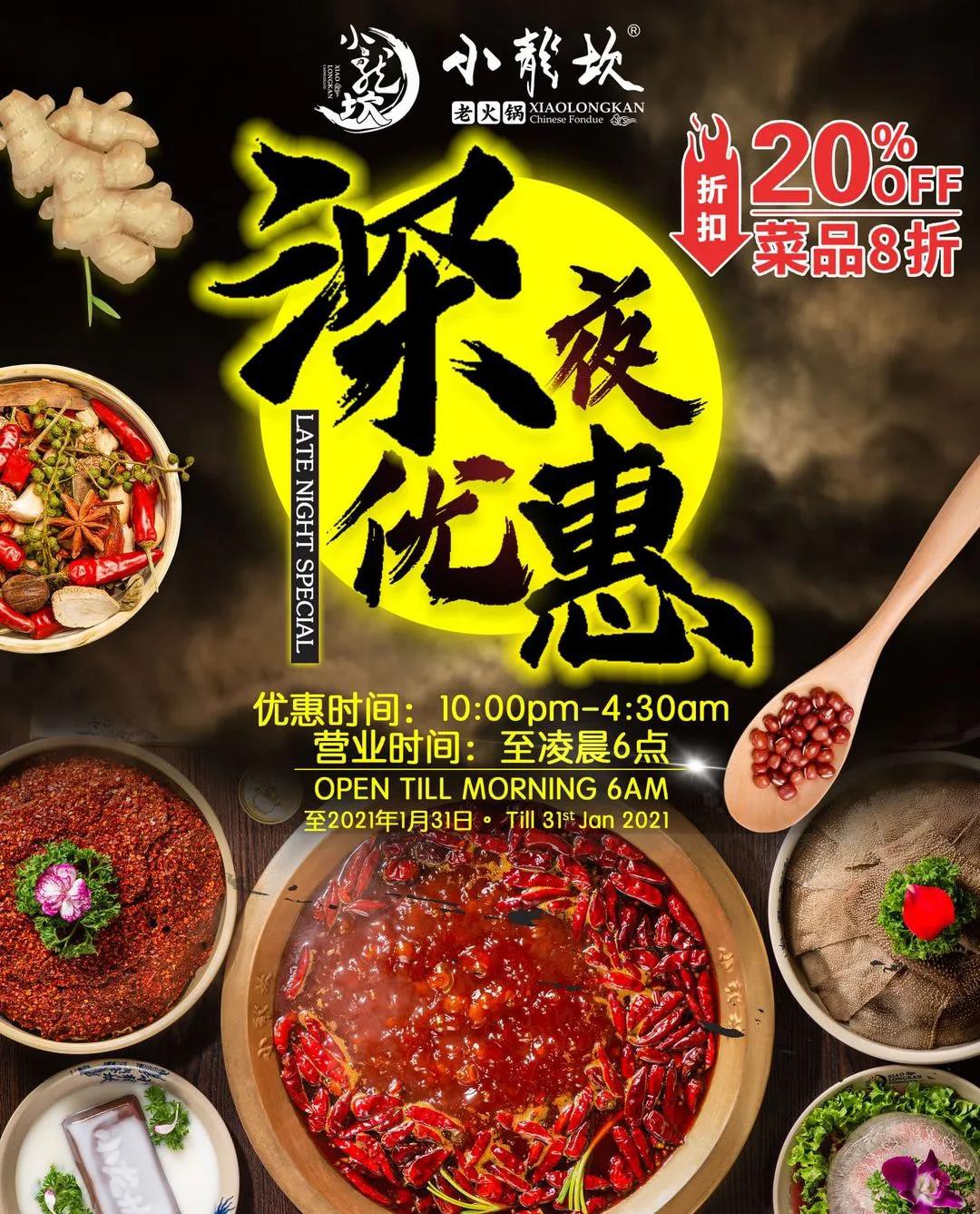 小龍坎老火鍋夜貓子福利來咯!小龍坎深夜優惠,晚上10點至淩晨4點半,堂食菜品20%優惠!